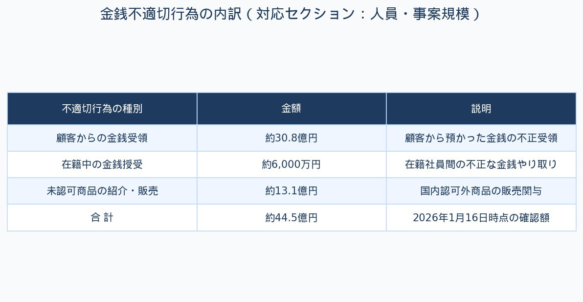 ・ 2026-01-16時点公表の金銭関与総額は、顧客からの金銭受領・借入等30.8億円、在籍中の金銭授受6000万円、未認可商品・業者紹介に伴う顧客支払い13.1億円の合計約44.5億円。
